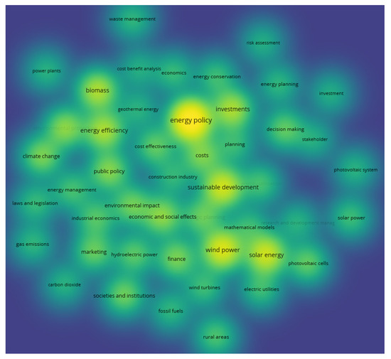 The density map (Figure 7) shows how much the keywords are explored. The prevailing keyword and, thus, the prevailing topic, are both “energy policy”.