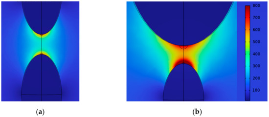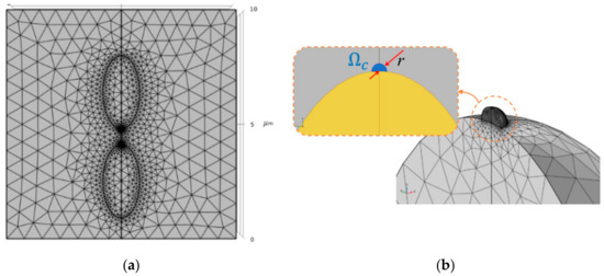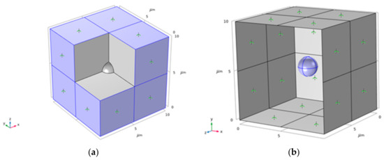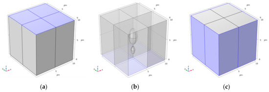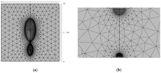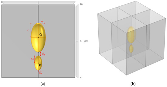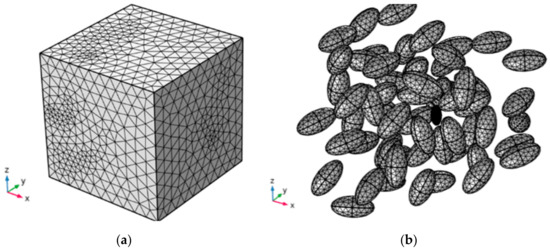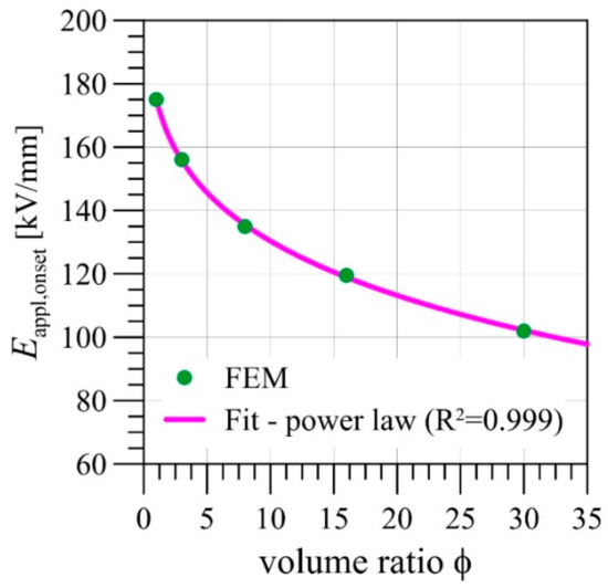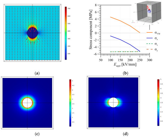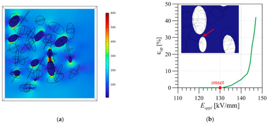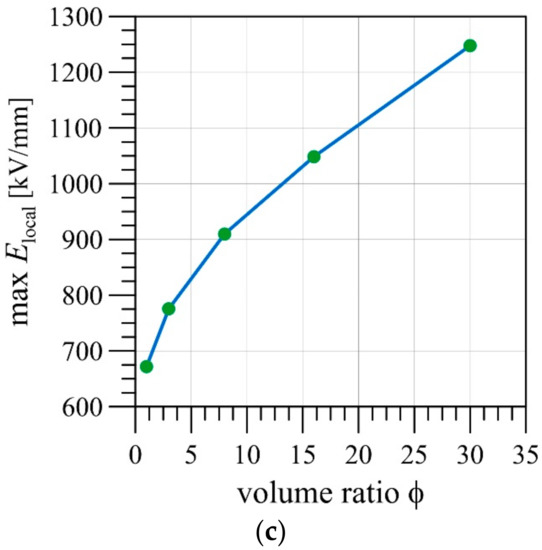 8], RVE has been exploited to study the pores’ deformation, leading to ellipsoids due to the polarization effect; intense electric fields and Maxwell stresses generate at the void tips, causing polymer yielding and coalescence between different pores. The deformation and material yielding around two ellipsoidal water-filled voids in a cubic RVE subjected to an intense electric field have been examined, and the effect of different geometrical variables such as orientation and number of voids has been predicted [