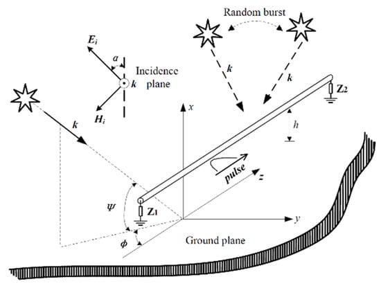 Many researchers have studied the coupling model of elevated line and electromagnetic pulse, and Figure 1 shows a coupling model. The first way to calculate the response of an elevated line under a HEMP is by solving the telegraph equation in the frequency domain and transforming the results into the time domain with inverse fast Fourier transformation (IFFT), known as the transmission line (TL) method. It is easy to consider a lossy ground environment around the transmission line and could be solved by analytic expressions. However, the TL method might be questionable when the cross-section of the line is not small with respect to the wavelength at high frequencies under a quasi-transverse electromagnetic assumption. Meanwhile, there is radiation loss on the line due to the discontinuities at the line termination. The other methods are full wave techniques such as finite difference time domain (FDTD) or method of moments (MoM). The advantage of these methods is that they are highly accurate by solving the response step by step in the time domain. However, it is time-consuming and unacceptable to pursue a statistical calculation since the single-time cost of the full wave technique is hour-level for long elevated lines in the power system. Commonly, for the statistical calculation of the response of transmission lines under an electromagnetic pulse, the TL method is used.