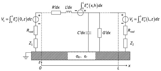 Zg′ approximates Sunde’s formula for the per-unit length Earth return impedance, γg is the propagation constant of the electromagnetic wave in the ground, and h is the height of the elevated transmission line. Obviously, the ground parameters are frequency dependent in real situations and influenced by many factors, such as percentage moisture content. However, only a slight difference of less than 4% of coupling response is obtained according to the reference []. Therefore, in this paper, relative permittivity and ground conductivity are considered constant.