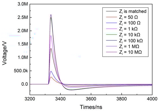 λ is the electromagnetic wavelength of a certain frequency. This radiating resistance is negligible at low frequencies and increases as a function of the frequency. Because the spectrum of the HEMP is so high, the losses increase dramatically for the transmission line response calculation. The radiating resistances are set at both ends of the transmission line. However, resistance only plays an important role when the termination value is comparable with radiating resistance. In this paper, the value of termination is 1 MΩ, which expresses the status of open voltage and the influence of different values of terminations on the voltage, as shown in Figure 3. In the calculation, the standard E1 HEMP waveform with 50 kV/m amplitude, 2.5 ns rise time, and 23 ns pulse width defined by IEC is selected.
