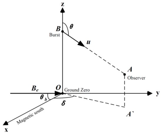 The vector u in Figure 4 defines the HEMP pulse from burst to the elevated transmission line, and Be defines Earth’s magnetic field vector. The dip angle θdip between the magnetic south and the dip angle θdip would influence the polarization angle α of the HEMP pulse as follows.