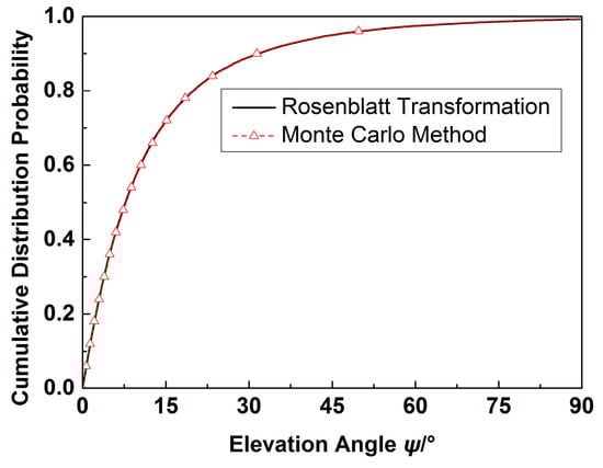 The cumulative distribution probability of elevation angle Ψ using Monte Carlo and Rosenblatt Transformation.