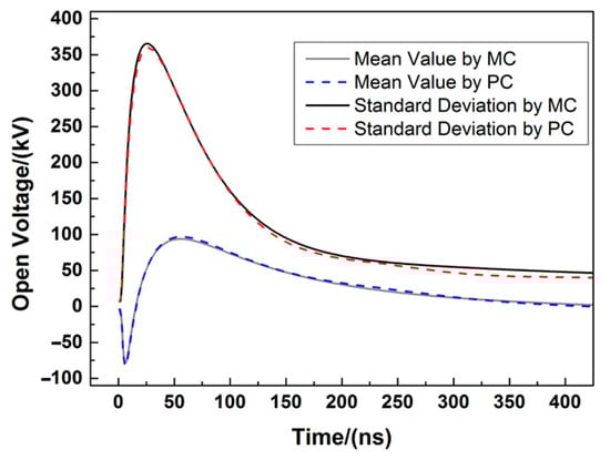 In this verification, we generate 246,240 Monte Carlo samples which are required by IEC 61000-2-10 and its reference []. Meanwhile, 10 Gauss integral points are used to calculate 7-order Polynomial Chaos Expansion. Because all the variables after the Rosenblatt transformation have the type of uniform distribution, the Legendre polynomial is introduced in the Polynomial Chaos Expansion. The mean value and standard deviation of the open voltage of an elevated transmission line under a HEMP using the Polynomial Chaos and Monte Carlo method are shown in Figure 6. It is obvious that the two methods fit well. According to Equation (13), well-fitting of mean values, means, and standard deviation indicates that the integral accuracy and the order of Polynomial Chaos Expansion are acceptable, respectively. In the same computing situation, the time costs are 0.53 h and 13.12 h for Polynomial Chaos Expansion and Monte Carlo, respectively, which means Polynomial Chaos has 24.75 times efficiency improvement.