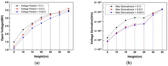 Different norms of overvoltage with different elevated transmission line heights and ground conductivity: (a) Voltage peak value; (b) Voltage max derivative.
