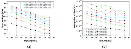 Different norms of overvoltage with different elevated transmission line heights and dip angle: (a) Voltage peak value; (b) Voltage max derivative.