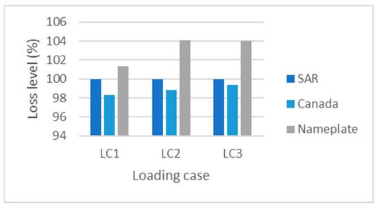 The analysis shows that the losses in the hot ambient temperature for the highly loaded transformer LC1 can be almost 2% higher than those in the cold ambient temperature. However, more striking is the fact that the losses calculated using the nameplate data can be up to 4% higher than those in the hot ambient or over 5% for the cool ambient (LC2). It should be noted that fan losses are not considered for the case of nameplate losses, so the difference would be even greater if they were included. The loss structure, which will be presented in the next section, also affects the differences in losses.