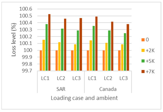 11], the application of sheds was shown to lower the temperature around the transformer and increase efficiency. To simulate this condition, a simplified case was analysed, increasing the temperature in the period of 9 to 19 by 2, 5, and 7 K each day. The results, presented in