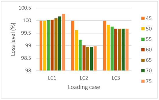 Figure 10 shows the top oil temperature distribution for LC1 during hot ambient temperatures, where the impact of different top oil temperature settings for the cooling equipment appears to be less significant. Regardless of the temperature setting, the number of hours when the transformer experiences top oil temperatures over 70 °C remains the same. However, the differences can be observed in the lower top oil temperature range (50–70 °C). This is because the loading case has a long period of high load, during which the cooling is always active and no difference can be seen. However, for the lower top oil temperature range (60–70 °C), the number of hours is reduced, and the transformer is switched to the moderate top oil temperature range (50–60 °C). This decrease in the number of hours spent in the 60–70 °C range also compensates for the accelerated aging during the overload period, as explained in [