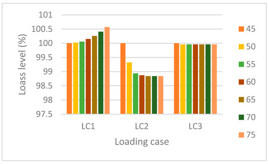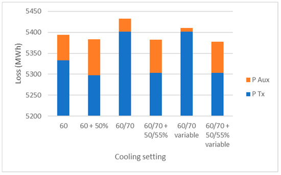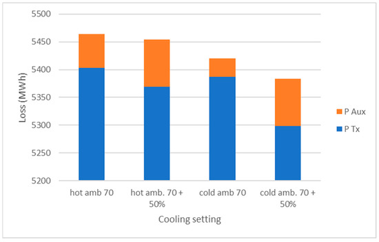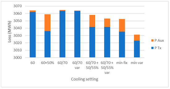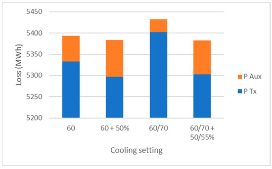 Figure 11 along with the results of the two-cooling stage setup, indicate that the setup where the second stage turns on at 60 °C and the third on at 70 °C is less efficient than the previously described cases, where there are only two stages and the turn-on temperature is either 60 °C or 70 °C. At first, the results may seem illogical, but the issue lies in the fact that the third stage is turned on when the transformer oil reaches 70 °C, with only half of the fans running. This means that the transformer needs to be loaded much more and run for longer in a non-efficient setup to turn on all the fans. Of course, the conclusions heavily depend on the loading case, and in some cases, this might be more efficient, but this would be only for a very specific, seldom case when the transformer reaches higher loadings. Other combinations of temperatures give similar conclusions.