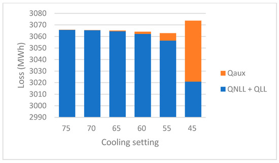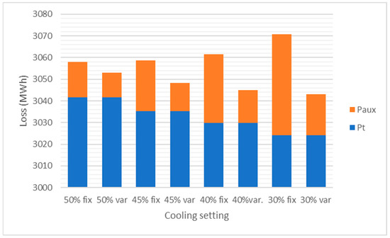 Figure 14, with the additional information regarding the minimum possible losses. This was achieved by selecting for each moment the most efficient setup without specific rules on temperature or load. It can be seen that the setups with the power settings are close to optimum for fixed speed fans, but the variable speed solution could provide about 0.7% than the minimum for fixed fans, or 1.1% less than the 60 °C setting.
