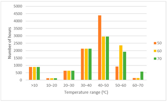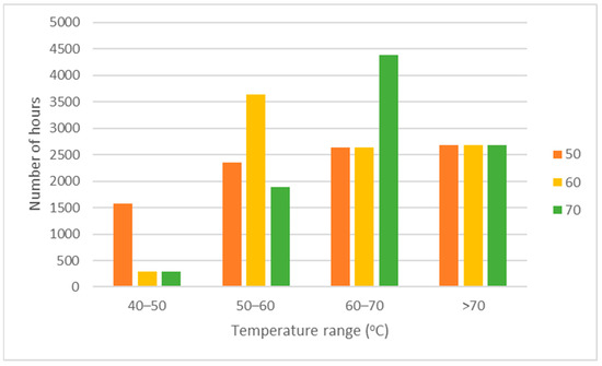 Figure 9, the top oil temperature distribution during the analysed period changes for different cooling settings for LC2 in the cold ambient temperature. With lower top oil temperature settings in the cooling equipment (50 °C), the number of hours in the higher top oil temperature range (50–70 °C) decreases and switches to a moderate top oil temperature range (40–50 °C). If we consider that each 6 K doubles the speed of aging [