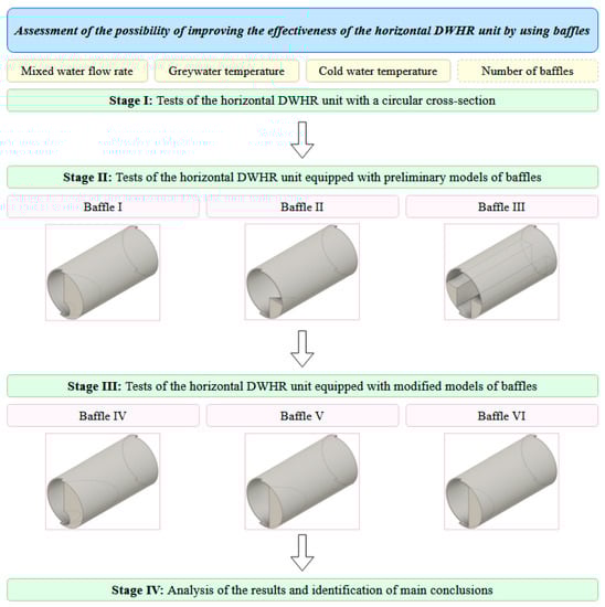 Research on the possibility of improving the effectiveness of the horizontal circular DWHR unit was carried out according to the procedure shown in Figure 1.