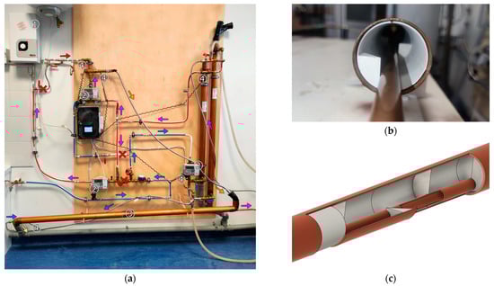 Tested horizontal DWHR unit: (a) test stand with the heat exchanger; (b) inside of the heat exchanger equipped with baffles; (c) cross-sections of a 3D model of the heat exchanger equipped with baffles: 1, hot water heater; 2, Sharky 473 ultrasonic flow meters; 3, tested DWHR unit; 4, Pt500 resistive temperature sensors; ➞ cold water flow direction; ➞ preheated water flow direction; ➞ hot water flow direction; ➞ mixed water flow direction; ➞ greywater flow direction at the outlet of the heat exchanger; ✖ no flow in the section.