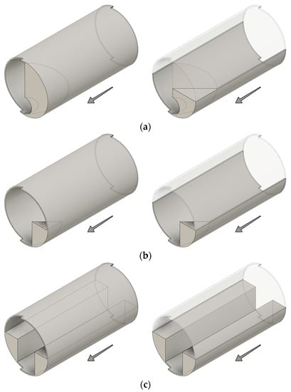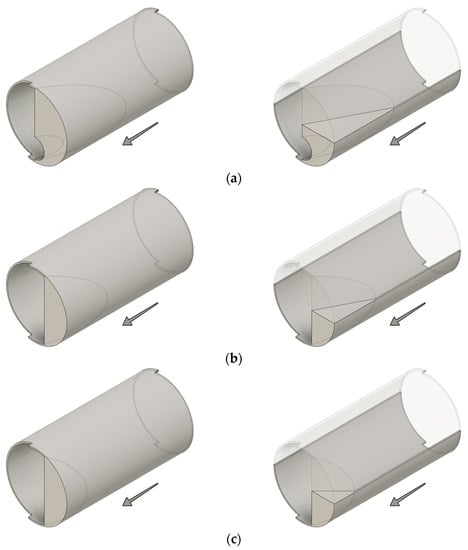 According to the procedure presented in Figure 1, the geometry of the baffles was determined in two stages. First, three preliminary baffle models were designed, and the validity of their installation in the horizontal DWHR unit with a circular cross-section was analyzed. After the results of laboratory tests were analyzed, these models were modified to improve the results. As a result, three other baffle models dedicated to use in circular horizontal DWHR units were developed. All baffle models were designed in such a way as to adhere closely to the outer wall of the heat exchanger from its inner side (Figure 2b).