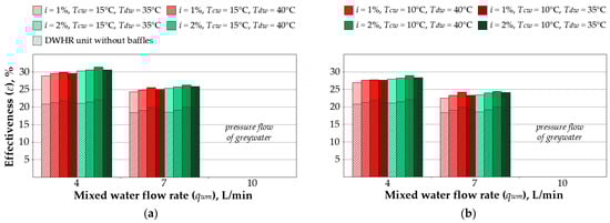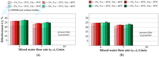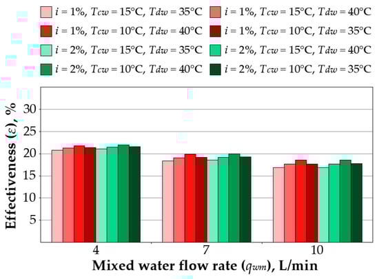 Figure 5 shows how the effectiveness of the tested DWHR unit is shaped in various operating conditions. The columns in red correspond to the situation where the heat exchanger was laid with a slope of 1%. On the other hand, the columns in green represent the effectiveness of the unit laid with a slope of 2%. The results indicate that the effectiveness of the DWHR unit increased as the flow rates of water and greywater through the unit decreased. This confirms the results obtained for other types of horizontal shower heat exchangers [,]. This trend was maintained in all cases, regardless of the slope of the bottom of the heat exchanger and the temperatures of both media that flowed through the unit. The effectiveness of the heat exchanger at a flow rate of both media of 4 L/min exceeded 20% in each case and was in the range of 20.83% to 22.02%. Therefore, it was lower than the effectiveness of vertical DWHR units, which ranges from 30 to even 75% []. The results for qwm = 10 L/min ranged from 3.21 to 4.18 percentage points lower than for qwm = 4 L/min, with the highest effectiveness decreases seen when the temperature difference between water and greywater was the lowest. Considering that many shower heads have a flow rate of 9–10 L/min, and qwm of 5–7 L/min is only characteristic of water-saving shower heads or those with a flow limiter installed, improving the effectiveness of this unit seems to be a necessity. Shower heads with a flow rate of qwm = 4 L/min are not commercially available. However, it should be noted that, in some residential buildings, especially multistorey ones, the pressure in the system is not sufficient to provide an outflow corresponding to the features of the shower head. Considering the potential for energy recovery and the associated financial savings based solely on the technical data of the shower head would lead to unreliable results in such a situation.