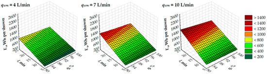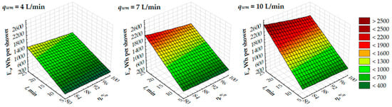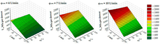 The research also determined the amount of energy that could be recovered (Es) during a shower of a certain length (l). Figure 12 and Figure 13 show the results determined under the assumption that the instantaneous DHW heater worked with the heat exchanger equipped with 20 baffles. The figures show the most advantageous solution under the given conditions. Therefore, the plots relating to the flow rates (qwm) of 4 L/min and 7 L/min assumed that the DWHR unit was equipped with type IV baffles. For the flow rate of qwm = 10 L/min, the results for type V baffles were based on. Similarly to the DWHR unit without baffles, the two most extreme cases were depicted. The results confirmed that the temperatures of the media flowing through the heat exchanger and the slope of its bottom have a significant impact on the energy savings resulting from the application of the greywater heat recovery system. The higher the water flow rate from the shower head, the greater the differences in the effects, which is related to both an increase in mixed water consumption and a decrease in the effectiveness of the DWHR unit.