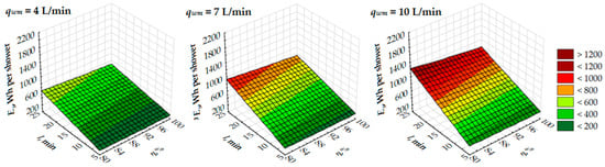 Based on research, it can also be seen that the total amount of energy recovered from greywater (Es) at a given shower length (l) increases with increasing qwm, although the effectiveness of the DWHR unit (ε) decreases. This is due to the increase in the volume of the heat source medium and the volume of the heated water. In the most favorable situation, during a 10-min shower, the use of the DWHR unit will save between approximately 380 Wh and even more than 800 Wh, respectively, at qwm = 4 L/min and at qwm = 10 L/min. Figure 6 and Figure 7 show the amount of energy that can be saved during one shower of a given length. Figure 6 is based on the assumption that i = 2% and ΔT = 30 °C. On the other hand, Figure 7 refers to the situation when i = 1% and ΔT = 20 °C. The results confirm that the operating parameters of the installation and the slope of the DWHR unit bottom have a significant impact on the amount of energy that can be saved. As a result, these parameters also determine how large of a reduction in greenhouse gas emissions can be achieved by the user of a particular type of heat exchanger.