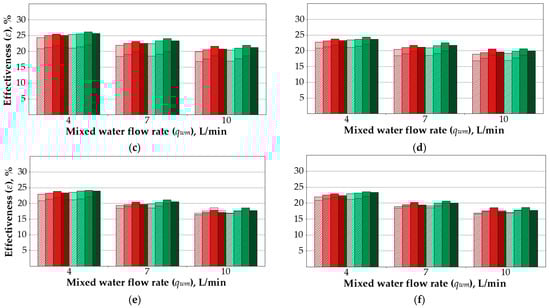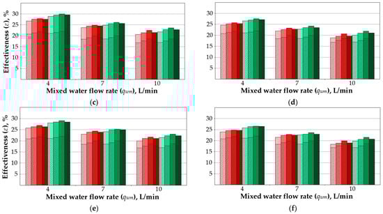 The effectiveness of the DWHR unit equipped with preliminary baffle models: (a) type I, 20 baffles; (b) type I, 10 baffles; (c) type II, 20 baffles; (d) type II, 10 baffles; (e) type III, 20 baffles; (f) type III, 10 baffles (designations as in Table 2).
