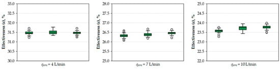 The research also confirmed the trend described in [,], which was that the greater the temperature difference between water and greywater (ΔT), the higher the effectiveness of the DWHR unit. This makes the use of DWHR units especially beneficial in winter, when the energy demand for heating water is the highest due to the low temperature of cold water []. In the case of the circular heat exchanger, an increase in ΔT from 20 °C to 30 °C resulted in an increase in the effectiveness of 0.93–1.73 percentage points. The observed differences increased with increasing media flow through the heat exchanger. The effect of the bottom slope (i) on the unit susceptibility to changes in effectiveness was also observed depending on the value of ΔT. The increase in i resulted in a slight decrease in the observed differences in effectiveness of the DWHR unit.