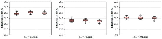 As part of the research, the uncertainty of the measurements was also analyzed. Figure 10 and Figure 11 present the results obtained with the use of the most favorable baffle models during three measurement series. The length of each series was 15 min. These results confirm the repeatability of experimental results and prove that the heat exchanger will work stably even during long-term water intake from the shower head.