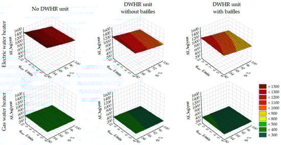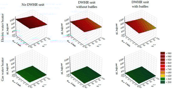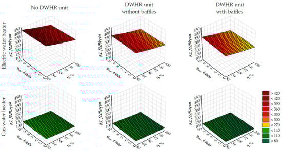 Based on the calculations, it was also possible to determine the possible financial and environmental benefits of using the DWHR unit on the shower waste pipe. Figure 14 and Figure 15 show the theoretical annual water heating costs for a family of three. The plots considered the use of the DWHR unit with and without baffles, as well as the lack of a greywater heat recovery system. All results were estimated assuming the shower water consumption of 35 L per person per day. The findings presented in the surface plots indicate that the amount of fees incurred to heat water for showering is primarily determined by the type of domestic hot water heater (WH). If an electric hot water heater (EWH) is used, the annual cost of heating water is approximately EUR 240 to EUR 425 depending on the mixed and cold water temperatures and the effectiveness of the unit. An increase in the temperature difference (ΔT) by 10 °C results in an increase in the annual water heating costs (AC) by almost 40%. On the other hand, the use of a low-efficiency water heater (η = 80%) can increase these costs by 25%. The cold water temperature depends on the season and the climatic zone and cannot be influenced by the user. However, the user has influence on the temperature of the water delivered to the WH. Preheating water with the use of the DWHR unit without baffles can reduce the cost of heating water for showering by several percent. The use of the heat exchanger equipped with baffles saves approximately 17% (for qwm = 10 L/min and ΔT = 20 °C) to more than 27% (for qwm = 4 L/min and ΔT = 30 °C) of the expenses incurred for this purpose. If an electric water heater is used, a family of three can expect to save up to EUR 115 per year. Assuming constant water consumption per person, regardless of the characteristics of the shower head, the most significant financial savings can be made when the WH efficiency (η) and the mixed water flow rate (qwm) are the lowest of those analyzed, while ΔT is the highest. This is because, in such conditions, both the energy usage for water heating and the effectiveness of the heat exchanger are the highest.