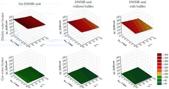 Annual water heating costs for showering for ΔT = 30 °C and i = 2%: AC, annual water heating costs; qwm, mixed water flow rate; η, domestic hot water heater efficiency.