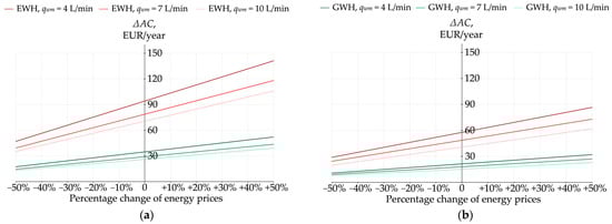 Evaluation of the impact of changes in unit energy prices on annual financial savings resulting from the use of the DWHR unit with baffles: (a) ΔT = 30 °C and i = 2%; (b) ΔT = 20 °C and i = 1% (EWH, electric water heater; GWH, gas water heater; ΔAC, annual financial savings, EUR/year; other designations as in Figure 6).