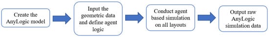 To generate these occupancy profiles AnyLogic software [28] was used. Figure 1 illustrates the main steps in the first stage of the research. The agent-based and discrete event modeling was completed using AnyLogic. First, the AnyLogic model was created, then the geometric data of the five simulated office layouts was input. To simulate the office environment, agent-based simulation was conducted by defining logistics such as schedules and probability events. Then the simulation was conducted on all five layouts individually in a span of 200 simulated workdays. Finally, the model output the raw occupant count to be further implemented in the next stage.