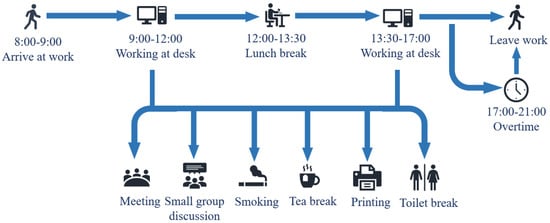 All agents arrive evenly between 8:00 and 9:00. Upon arrival, the role of the agents will be specified, and two agents will be set up as the manager and located in a separate office. Based on the population of smokers in the UK in 2018 [29], 15% of the agents will be set as smokers. This enables the possibility of triggering the smoking event. From 9:00 to 12:00, the agents will stay at their assigned tables. During this time, the specification of the possible events is listed in Table 1. Lunch break for all agents will happen between 12:00 and 13:30, and all events will be suspended during this period, agents will either stay at their Table (50% possibility), go to the staff lounge (30% possibility), or decide to leave the office (20% possibility). After a lunch break, all agents will go back to their desks, and the meeting event will resume. All possible events in the afternoon will be the same as in the morning. The regular working day is over at 17:00; however, the agents will have a 10% chance of staying for overtime. The length of overtime has a uniform distribution of between 30 min and 240 min. All agents will leave before 21:00.