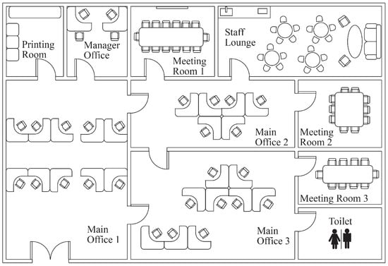 The office model consists of six types of rooms: main office space, manager office, meeting room, printing room, staff lounge, and toilet. A total of five layouts were created in AnyLogic to generate occupancy data, the 5 layouts have a different combination of main office space and meeting room count. The layouts shown in Figure 3 were applied as the training set for the training of the neural networks in the next stage. Layout 5, shown in Figure 4, was the testing set used for verifying the neural networks later.