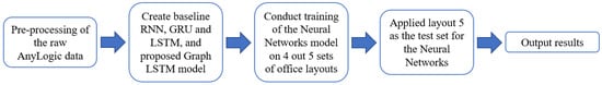 After the occupancy profiles from AnyLogic simulations were obtained, they were used to research the proposed neural network framework. Figure 5 shows the flow chart of the steps performed in the neural network construction and testing stage of this research.