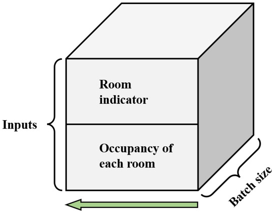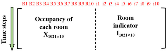 To represent different layouts in the same matrix, all data are pre-processed using MATLAB before using as the input of the neural network. For each set, the occupancy data are combined with a room indicator, as shown in Figure 6. As the maximum number of rooms for this study is ten rooms, all occupancy is updated into matrix , where each column represents the occupancy of each room. If the room is not present in the layout, the whole column will be zero. A matrix of dummy variables is also added to indicate if each room is presented in the layout. The whole column will be 0 if the room does not exist in the layout, and 1 if the room exists. The combination of the new occupancy matrix and the matrix of room indicator is then the input used to create the neural network.