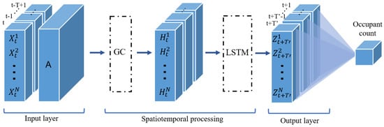 Figure 9 illustrated the proposed Graph LSTM model. The input layer consists of graph signal , which includes the occupancy data of each room at each time step for all training sets, and adjacency matrix A. This input is then passed through a graph convolution layer to compute the spatial features . The combination of the spatial features calculated and the graph signal , is then fed to the LSTM layer. Next, the product from the LSTM layer is directed through an output layer, where the predicted occupancy value will be computed and rounded to the nearest integer before outputting for further analysis.
