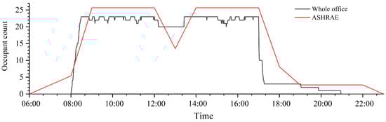 For all five office layouts, the simulation in AnyLogic produced a similar occupancy pattern for each room. Figure 10 shows a set of total occupant counts produced using Layout 2. The space is occupied between 8:00 and 21:00, with higher occupancy during regular working hours, a small drop during lunch break, and a sharp decrease when overtime started. This overall trend is as expected and is similar to the office occupancy provided by ASHRAE [7]. As seen in the figure below, compared to the ASHRAE profile, the occupancy data produced from the simulation fluctuate more during working hours, as the model accounted for the possibility of agents leaving the office for a short period.
