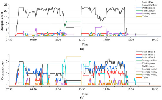 Figure 11 shows the occupancy profile of one simulated day of all individual rooms from layouts 1 and 5. From analyzing the overall pattern of the data presented, all rooms have a highly fluctuated profile due to events created in the model, where the agents had to travel to different rooms. The areas such as the main offices, where most rooms are connected, often show large peaks due to the occupants passing through to reach another location. Each simulation of the same layout generates slightly different occupancy due to the nature of the probability settings, but the overall trend remains similar.