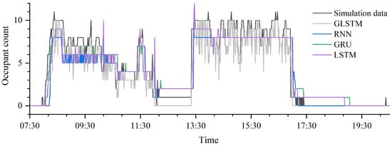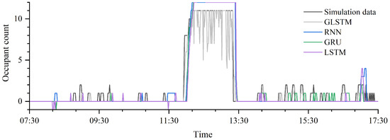 Figure 12 shows the AnyLogic data and neural network predicted occupancies of the main office 1 in one set of data produced with Layout 5. All models predicted the overall occupancy trend of the space well. As the complexity of the neural network increases, the detail of the outputs improves. The three baseline neural networks, RNN, GRU, and LSTM, tend to produce a profile with relatively constant occupancy, where only the general trend and the larger spikes were predicted. Moreover, the forecasted occupant count is usually lower than the actual value. Although the Graph LSTM produced a highly noisy result, the overall trend fits the AnyLogic simulation result well.