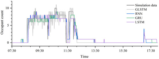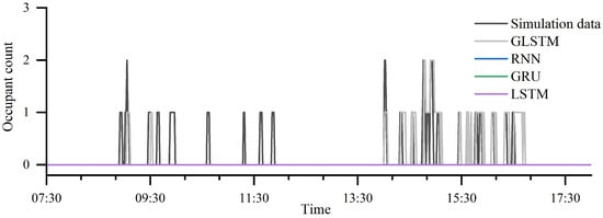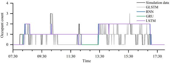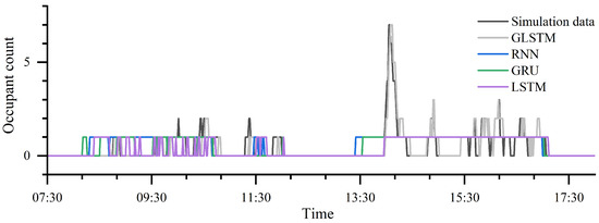 The results from the neural networks for the manager’s office are shown in Figure 15. The Graph LSTM can represent the overall trend decently, despite the noise presented. However, the baseline results produced relatively constant occupancy and failed to include more details. A possible explanation is that the room is always occupied at a meager occupant count. This limited the amount of detail that could be included in the training data.