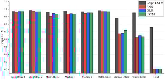 To further analyze the predicted occupancy profile for individual rooms under different neural networks, the evaluation matrices, IA, MAE, and RMSE, were computed and shown in Table 3. The Graph LSTM presented the best performance across all three evaluation matrices for all rooms.