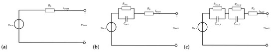 The examination of various battery technologies in Table 1 sets the stage for a deeper understanding of the battery behavior, whereas the circuit models serve as an effective tool for simulating and analyzing the internal physics of the batteries. The simplest circuit model is known as the internal resistance (IR) model and is depicted in Figure 1a. The model consists of an ohmic internal resistance (), the battery output current (, which is negative during charging and positive during discharging), the terminal battery voltage (), and the open circuit voltage (OCV, ) that is measured when there is no current flowing through the circuit. The internal resistance and OCV are functions of SOC, SOH, and temperature, providing crucial insights into the battery performance and behavior. However, the IR model is not suitable for accurately estimating the SOC during dynamic operations (non-constant load) as it does not capture the transient behavior of the cells. A more advanced model, known as the one-time constant (OTC) model, can be used to address such issue. In the OTC model, a parallel RC network is added in series to the internal resistance of the IR model to better approximate the dynamic behavior of the battery. The OTC model depicted in Figure 1b consists of three main parts: the voltage source ; the ohmic resistance ; a system constituted by the parallel of a resistance and a capacity that describes the transient response of the battery during charging or discharging [51].