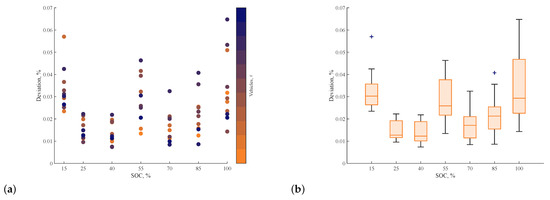 (a) The deviation point value for each vehicle and each state of charge, (b) Deviation boxchart: a visual representation of summary statistics for a sample of data, including the median, the lower and upper quartiles, outliers (denoted by a + sign), and the minimum and maximum values that are not outliers.
