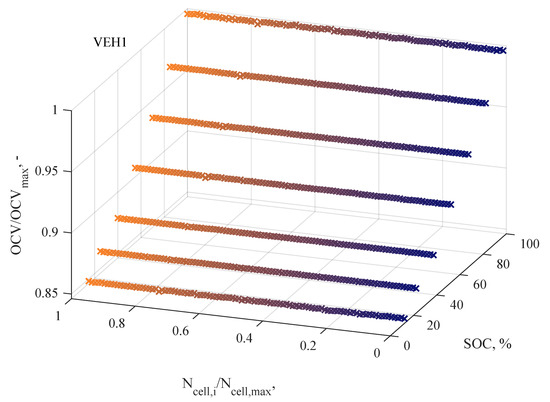 As an example, Figure 3 shows a plot of the recorded OCV for at different SOC levels for all the considered cells. The OCV generally decreases as the SOC decreases, which is consistent with the expected behavior of a lithium-ion battery. Both the OCV values and the cell numbers were properly normalized. More specifically, the OCV values were normalized by dividing each value by the OCV maximum, while the number of cells in each group was divided by the total number of cells in the battery. It should be noted that only slight deviations are observed among the various cells.