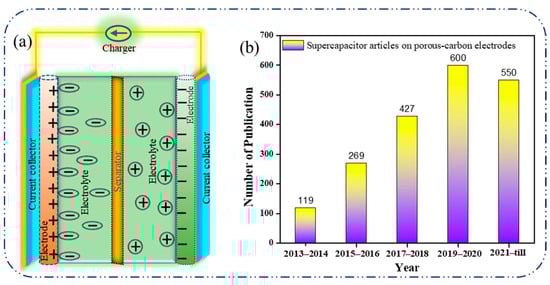 (a) Schematic illustration of a supercapacitor and (b) publication on porous-based carbon electrodes produced from different sources for supercapacitors reported from 2013 to present (March 2023).