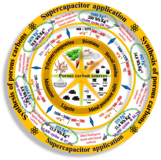 The current advancements of porous carbon from different sources, their lowest and maximum surface area ranges, the best results of their specific capacitance, and energy density cycle performances are all represented graphically.