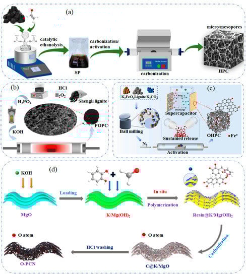 Schematic illustration of the synthesis of porous carbons using carbonization: (a) HPC, reproduced with permission from [63], Copyright 2023, Elsevier. (b) POPC, reproduced with permission from [64], Copyright 2023, Elsevier. (c) OHPC, reproduced with permission from [65], Copyright 2023, Elsevier and (d) O-PCN, reproduced with permission from [66], Copyright 2023, Elsevier.