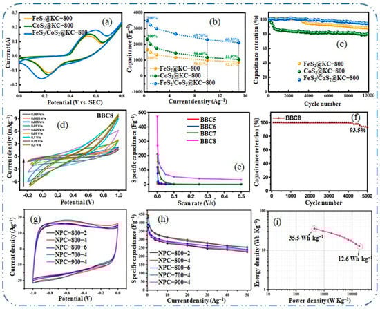 (a–c) CV analysis at 50 mV s−1, specific capacitance and cyclic performances of FeS2/CoS2@PC-800 [57], (d–f) CV curve, specific capacitances to the scan rate, and stability analysis of BBC-800 [58], and (g–i) CV tested at 50 mV s−1, specific capacitance plot, and Ragone curve of NPC800-4 [56], Copyright 2023, Elsevier.