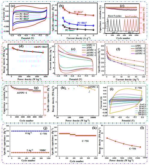 CV, specific capacitance, stability analysis, and Ragone plot of (a–d) PCR6A7, reproduced with permission from [84], Copyright 2023, Elsevier. (e–h) ASNPC-1, reproduced with permission from [76], Copyright 2023, American Chemical Society. (i–l) C750, reproduced with permission from [86], Copyright 2023, Elsevier.
