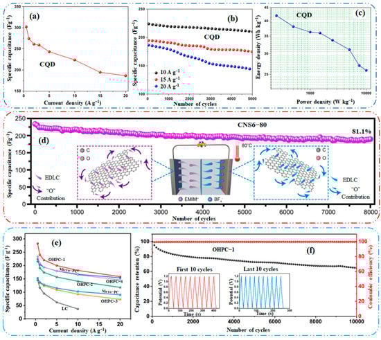 (a–c) Specific capacitance plot, cyclic stability, and Ragone plot of CQD, reproduced with permission from [88], Copyright 2023, Elsevier. (d) Cyclic performance of CNS6-80, reproduced with permission from [71], Copyright 2023, Elsevier. (e,f) Specific capacitance plot and stability performance over 10,000 cycles of OHPC-1, reproduced with permission from [65], Copyright 2023, Elsevier.