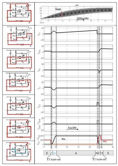 During the turn-on process (stages F, G in Figure 2) of the transistor in the vertical branch (e.g., T1), the auxiliary capacitor C2 is charged from the upper dc-link capacitor connected in series with the resonant inductor (Cin1, T1, C2, Dh3, Lres). In the case when the commutation of the load current from the upper transistor of the vertical branch to the horizontal branch occurs, the auxiliary capacitor C2 discharges (stages B, C, and D in Figure 2). After the vertical switch T1 is turned off, the current flows via the lower capacitor C2, causing its discharging. The rate of voltage decrease across the C2 capacitor determines the rate of voltage rise across the transistor during its turn-off process. At the same time, the current on the auxiliary choke rises and the process of commutation finishes when the current flows via the horizontal branch and the auxiliary choke. The turn-off losses on the vertical switches can be significantly decreased.