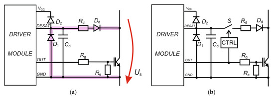 In case of a higher voltage potential on the emitter of a power transistor in the classic driver, there will be a current flow from the ground potential of the driver through the protection diode D1, resistor Rd, and diode Dd of the DESAT circuit (Figure 4a). This current will be practically limited only by the resistance of the resistor Rd. It is usually 100–1000 Ohms and depends on the IC used. For a voltage occurring at the power transistor of several hundred volts (for example, in an NPC inverter), the current flowing through the DESAT circuit could have a value of up to several amps which is destructive for the circuit.